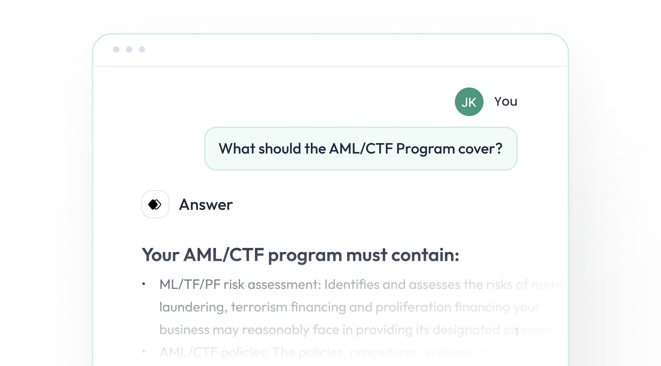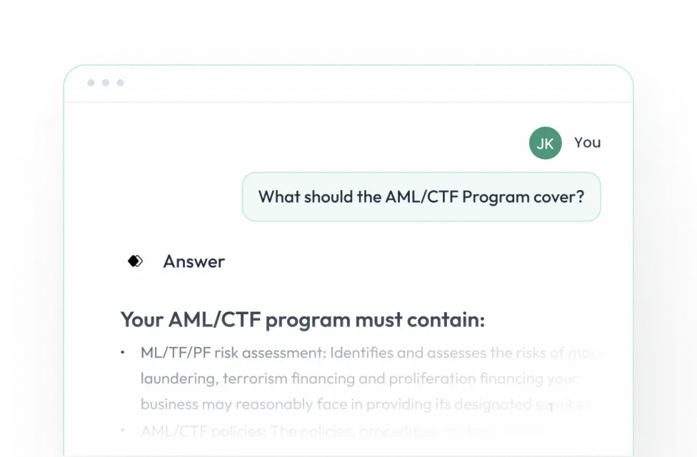 Searching for answers takes time and it's hard to know if you're right. Get real-time, reliable answers to AML/CTF questions based on law, guidance and your internal policies and documents.